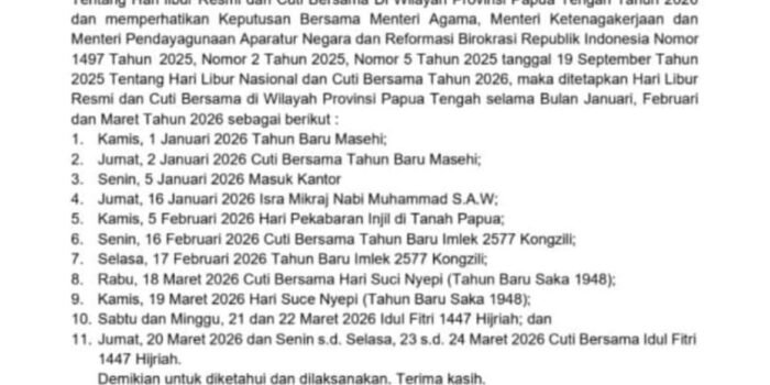 NABIRE, TOMEI.ID | Melalui kebijakan strategis berbasis regulasi pemerintahan daerah, Gubernur Papua Tengah, Meki Nawipa, secara resmi menetapkan hari libur nasional dan
