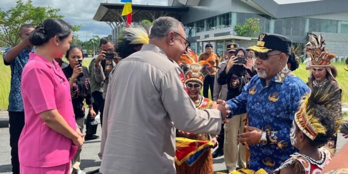 NABIRE, TOMEI.ID | Wakil Gubernur Papua Tengah, Deinas Geley, mewakili Gubernur Meki Nawipa, menyambut kedatangan Kapolda Papua Tengah, Kombes Pol. Yeremias Rontini,