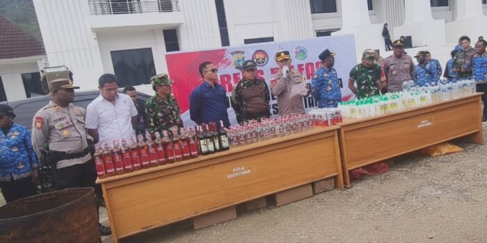 PANIAI, TOMEI.ID | Pemerintah Kabupaten (Pemkab) Paniai memusnahkan barang bukti minuman keras (miras) dalam apel pagi yang digelar di halaman Kantor Bupati,