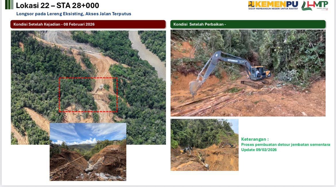 Tim di lapangan saat ini terus melakukan pembersihan material longsoran, perbaikan saluran lereng, pemasangan sandbag, penimbunan badan jalan, serta mobilisasi jembatan Bailey pengganti guna memulihkan konektivitas jalur strategis Trans Papua tersebut. Hingga kini, inventarisasi kerusakan dan potensi kerugian masih dalam proses pendataan lanjutan.