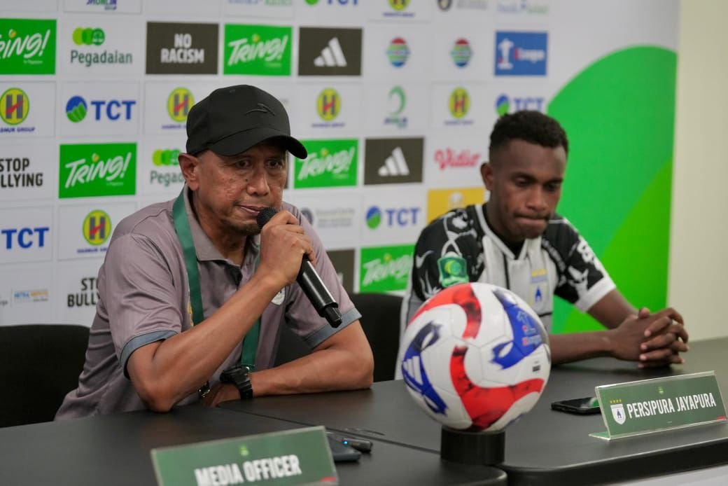 Pelatih RD bersama pemain muda Markus G. Waicang memberikan keterangan pada sesi jumpa pers usai pertandingan, Sabtu (17/1/2026). [Foto: Dok Media Persipura Jayapura].