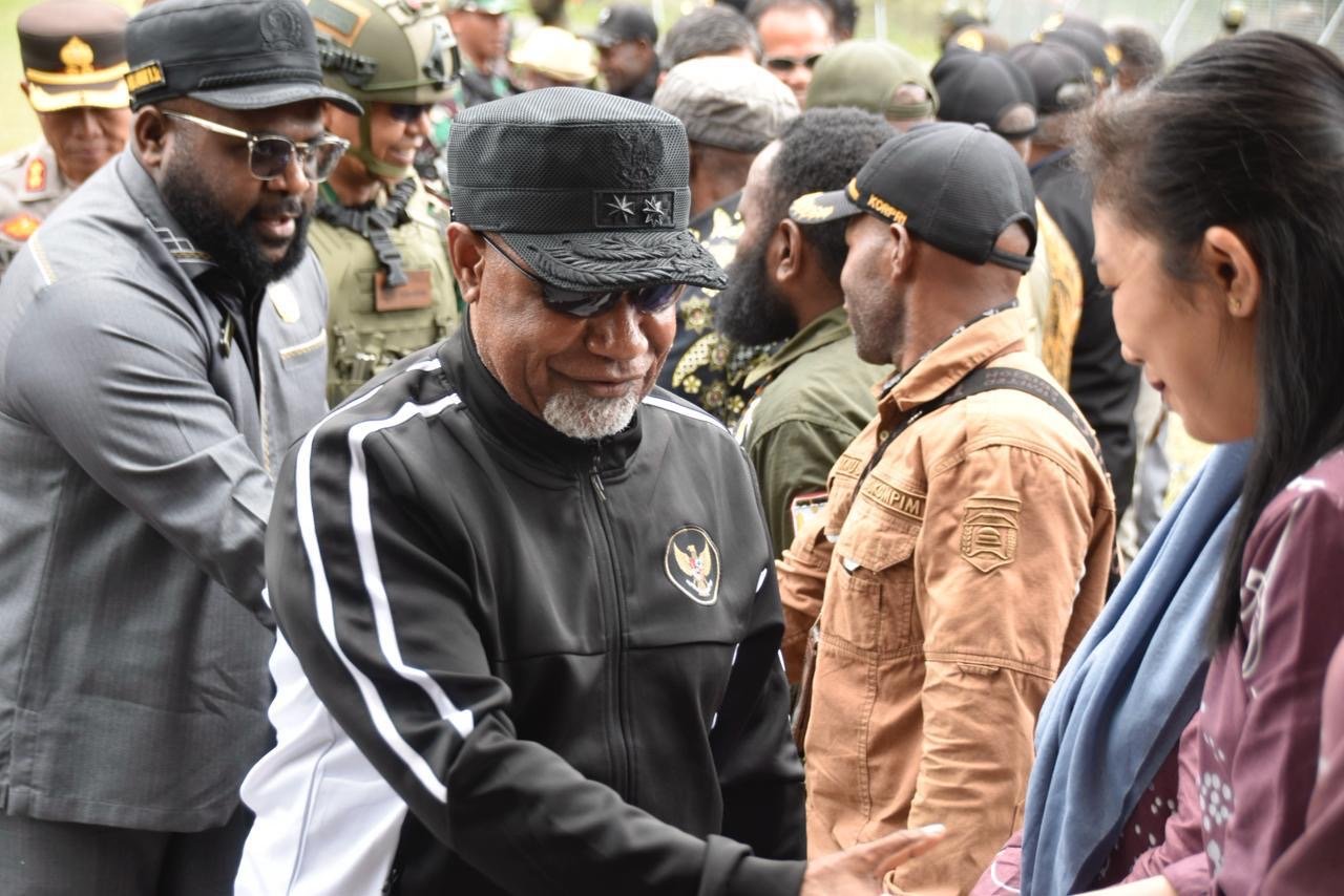 Gubernur Papua Tengah, Meki Nawipa, berjabat tangan dengan warga saat kunjungan lapangan di Mulia, Kabupaten Puncak Jaya, sebagai bagian dari upaya menyerap aspirasi dan memastikan situasi keamanan secara langsung. [Foto: Humas Setda Kabupaten Puncak Jaya].