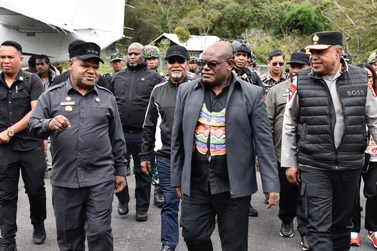 Gubernur Papua Tengah, Meki Nawipa, bersama Wakil Gubernur Deinas Geley dan Bupati Puncak, Yuni Wonda, didampingi aparat Tentara Nasional Indonesia dan Kepolisian Negara Republik Indonesia saat meninjau langsung situasi lapangan di Mulia, Kabupaten Puncak Jaya, dalam rangka uji fakta dugaan korban sipil. [Foto: Humas Setda Kabupaten Puncak Jaya].