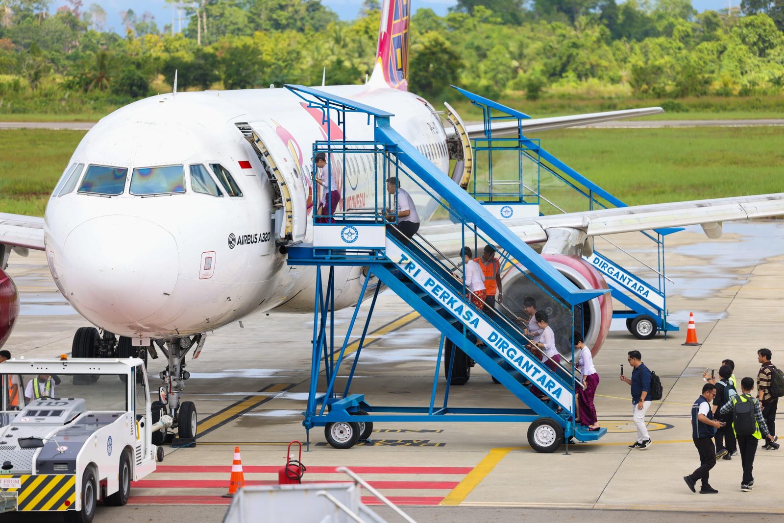 Kedatangan perdana pesawat Batik Air menjadi momen penting yang disambut dengan prosesi water salute, tradisi penyiraman air sebagai bentuk penghormatan dalam dunia penerbangan. Suasana penyambutan berlangsung khidmat dan penuh antusias dari berbagai pihak.