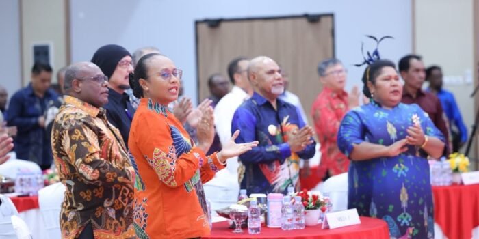 Gubernur Papua Tengah, Meki Nawipa, bersama Pelaksana Tugas (Plt) Kepala Dinas Pendidikan dan Kebudayaan Papua Tengah, Nurhaida Meki Nawipa, SE, berdiri dan bertepuk tangan saat mengikuti rangkaian talkshow refleksi satu tahun kepemimpinan Papua Tengah di Ballroom Kantor Gubernur, Nabire, Jumat (20/2/2026).