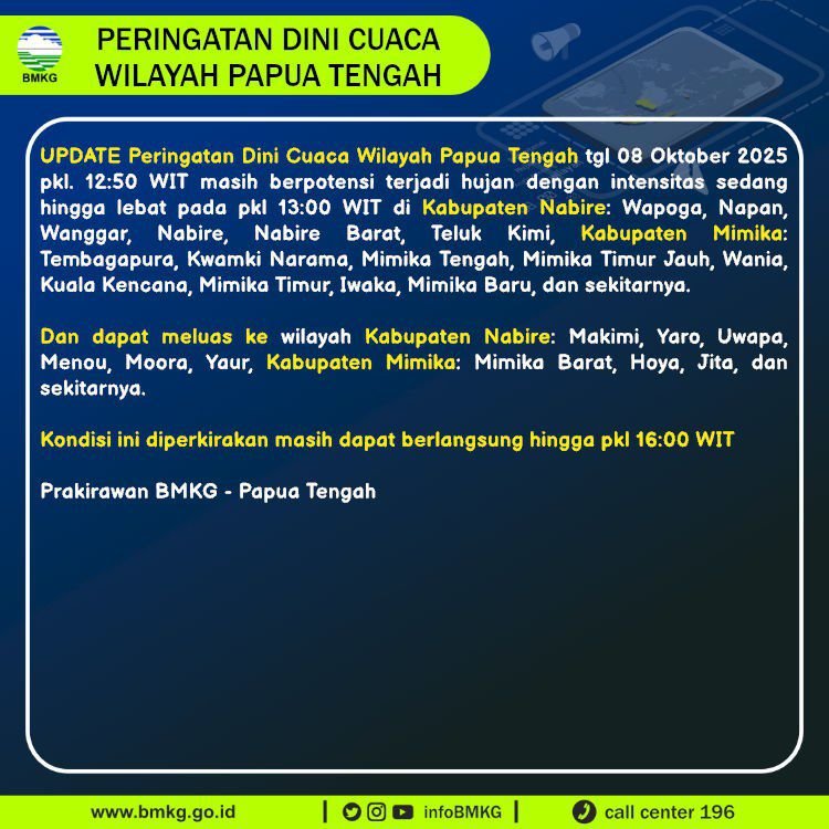 NABIRE, TOMEI.ID | Badan Meteorologi, Klimatologi, dan Geofisika (BMKG) Papua Tengah merilis peringatan dini cuaca ekstrem pada Rabu (8/10/2025) pukul 12.50 WIT. Berdasarkan hasil pengamatan terkini, sejumlah wilayah di Provinsi Papua Tengah berpotensi diguyur hujan dengan intensitas sedang hingga lebat yang dapat disertai kilat dan angin kencang.