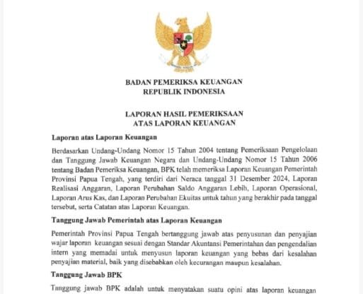 “Kecuali untuk dampak hal-hal yang dijelaskan dalam paragraf dasar opini wajar dengan pengecualian, laporan keuangan Pemprov Papua Tengah Tahun 2024 pada umumnya disajikan wajar sesuai Standar Akuntansi Pemerintahan,” tulis BPK dalam laporan pemeriksaan tersebut.