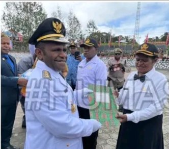 DEIYAI, TOMEI.ID | Bupati Deiyai, Melkianus Mote, menyerahkan secara simbolis Surat Keputusan (SK) Tenaga Harian Kerja Kategori 2 (THK2) dan Pegawai Pemerintah dengan Perjanjian Kerja (PPPK) usai upacara peringatan Hari Ulang Tahun (HUT) ke-80 Kemerdekaan Republik Indonesia di halaman Kantor Bupati Deiyai, Minggu (17/8/2028).