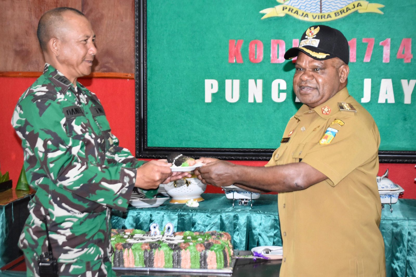 Acara syukuran yang berlangsung dalam suasana kebersamaan ini, ditandai dengan pemotongan kue ulang tahun oleh Bupati Yuni Wonda. Potongan kue pertama diserahkan kepada Pasi Ops Kodim 1714/Puncak Jaya, Kapten Inf. Daniel Sine, sebagai representasi dari Dandim.
