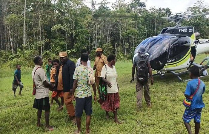 Rombongan bupati tiba di Bandara Okaito, Kampung Unito, menggunakan helikopter setelah menempuh perjalanan sekitar satu setengah jam melintasi perbukitan dan lembah Dogiyai.