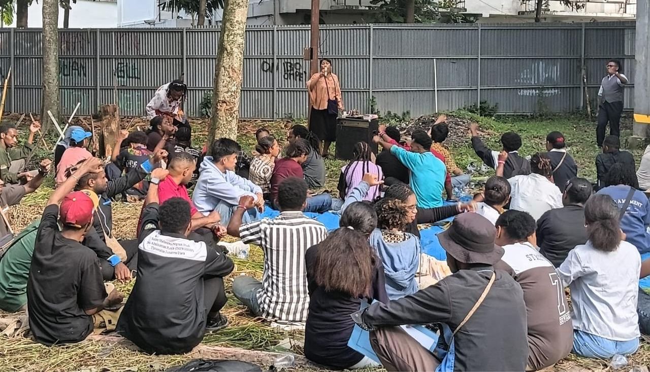 Suasana kebersamaan mahasiswa Papua saat mengikuti rangkaian Dies Natalis ke-12 Komunitas Mahasiswa Papua Se-Sumatera (KOMPASS) dan ke-13 Ikatan Mahasiswa Papua Sumatera Utara (IMP SUMUT) di Kota Medan, Jumat (14/2/2026). Peserta duduk melingkar di ruang terbuka sambil menyimak sambutan pengurus dan mengikuti prosesi tradisi Bakar Batu sebagai simbol solidaritas dan persaudaraan mahasiswa Papua di tanah rantau. [Dok Divisi Panpel ].