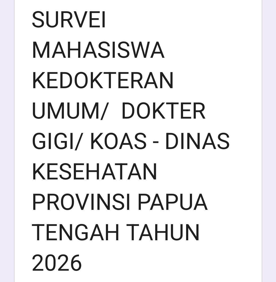 “Survei ini kami lakukan untuk memetakan tenaga kesehatan, termasuk siswa SMA kesehatan dan mahasiswa yang sedang menempuh pendidikan kedokteran umum maupun kedokteran gigi. Kami berharap survei ini dapat diisi serta diteruskan kepada seluruh tenaga kesehatan di wilayah masing-masing,” ujar Kabid SDM Dinkes Papua Tengah.