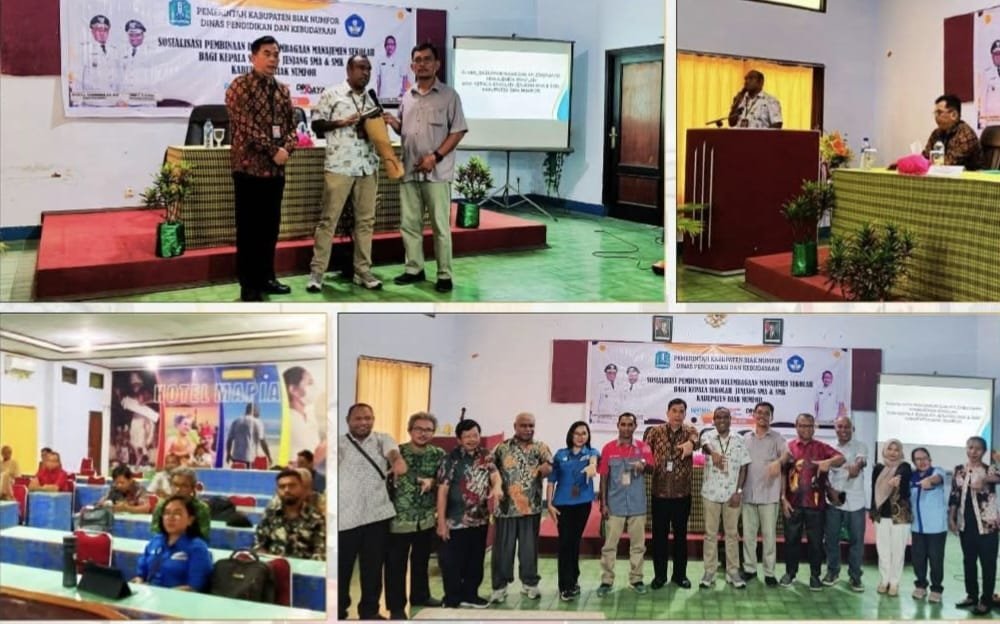 BIAK, TOMEI.ID | Dinas Pendidikan dan Kebudayaan (Disdikbud) Kabupaten Biak Numfor, Provinsi Papua, menggelar sosialisasi pembinaan dan penguatan kelembagaan manajemen sekolah bagi kepala sekolah SMA dan SMK lintas kabupaten sebagai upaya peningkatan mutu tata kelola pendidikan.