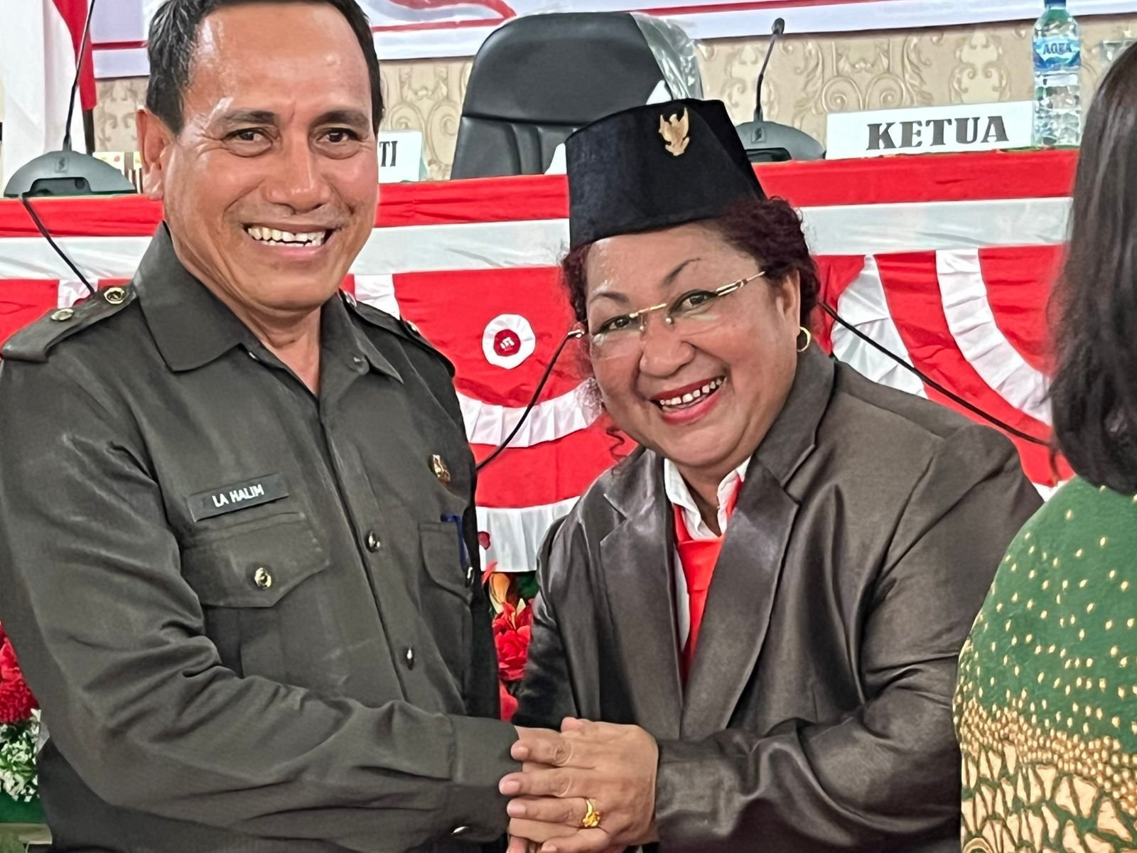Ketua DPRK Nabire berjabat tangan dengan unsur pimpinan daerah usai Rapat Paripurna penutupan Masa Persidangan 2025 dan pembukaan Masa Persidangan 2026 di DPRK Nabire, Kamis (22/1/2026). [Foto: Christian Degei/tomei.id).
