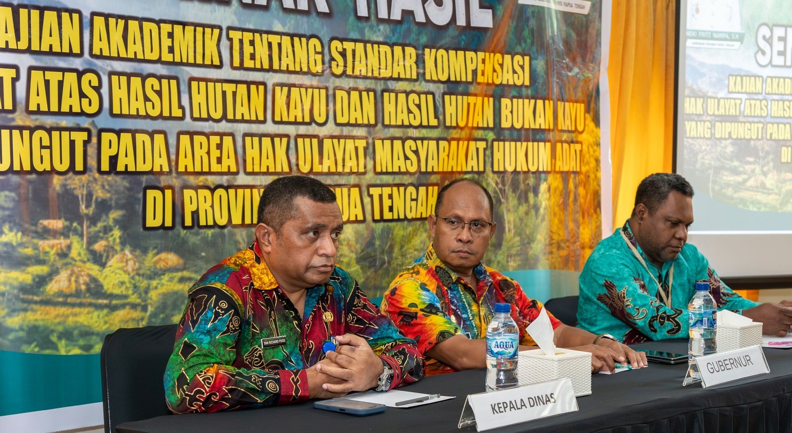 Pemerintah Provinsi (Pemprov) Papua Tengah, menggelar Seminar Hasil Penyusunan Kajian Akademik Peraturan Daerah tentang Standar Kompensasi Hasil Hutan Kayu (HAPKA) Perda (SK-HHK) dan Hasil Hutan Bukan Kayu pada Areal Hak Ulayat Masyarakat Hukum Adat (HHBK HU MHA). (Foto: Humas Pemprov Papua Tengah).