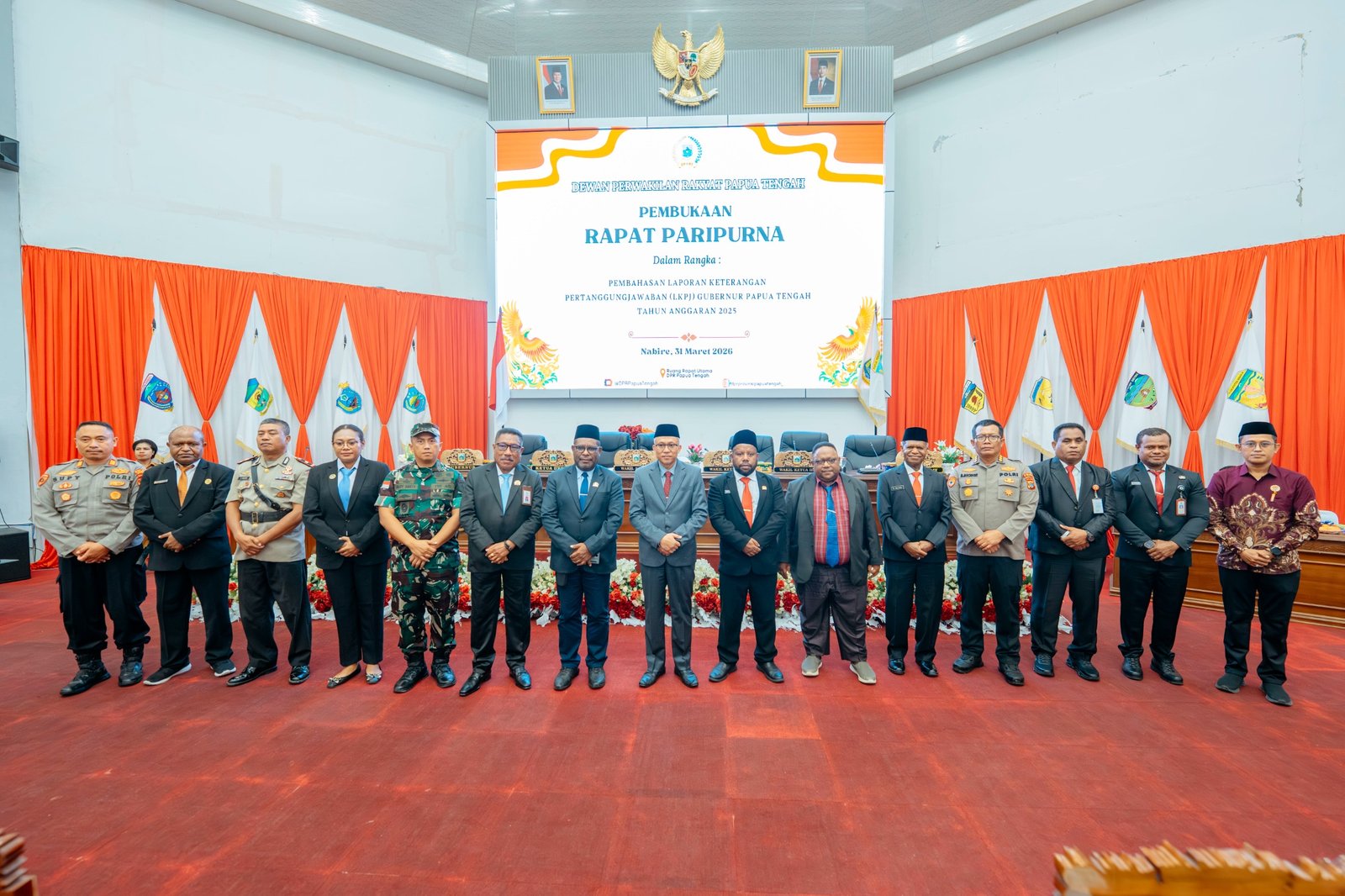 Rapat paripurna tersebut dihadiri pimpinan dan anggota DPR Papua Tengah, unsur Forum Koordinasi Pimpinan Daerah (Forkopimda), pimpinan instansi vertikal, kepala organisasi perangkat daerah (OPD), serta tokoh masyarakat dan insan pers.