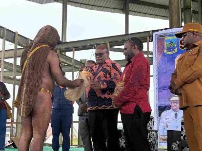 Sementara itu, Ketua Panitia Pembangunan Gereja, Stefanus Adii, menyerahkan noken simbolik berisi aspirasi umat kepada Gubernur dan Bupati sebagai wujud harapan agar pembangunan dapat segera diselesaikan.