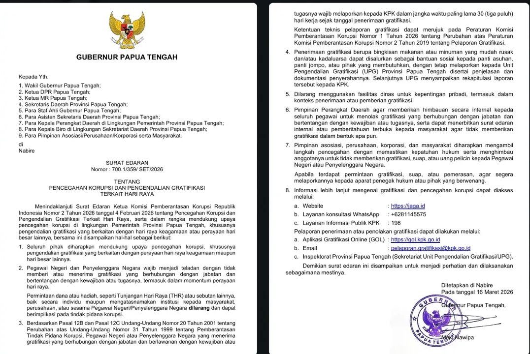 Surat edaran yang ditandatangani pada Senin, 16 Maret 2026 itu menjadi langkah tegas Pemerintah Provinsi Papua Tengah dalam menekan praktik gratifikasi yang kerap meningkat pada momentum hari raya.