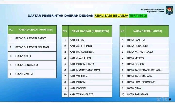 Dalam laporan Kemendagri tersebut, Sulawesi Barat tercatat sebagai daerah dengan realisasi belanja tertinggi pada kategori provinsi, sementara Kota Langsa menempati posisi teratas di kategori kota.