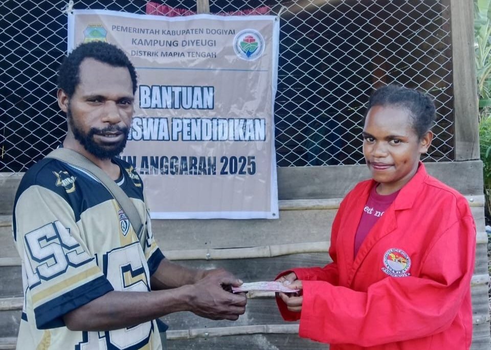 DIYEUGI, TOMEI.ID | Pemerintah Kampung Diyeugi, Distrik Mapia Tengah, Kabupaten Dogiyai, Papua Tengah, menegaskan komitmennya terhadap pembangunan sumber daya manusia dengan menyalurkan bantuan dana pendidikan kepada pelajar dan mahasiswa asal kampung tersebut.