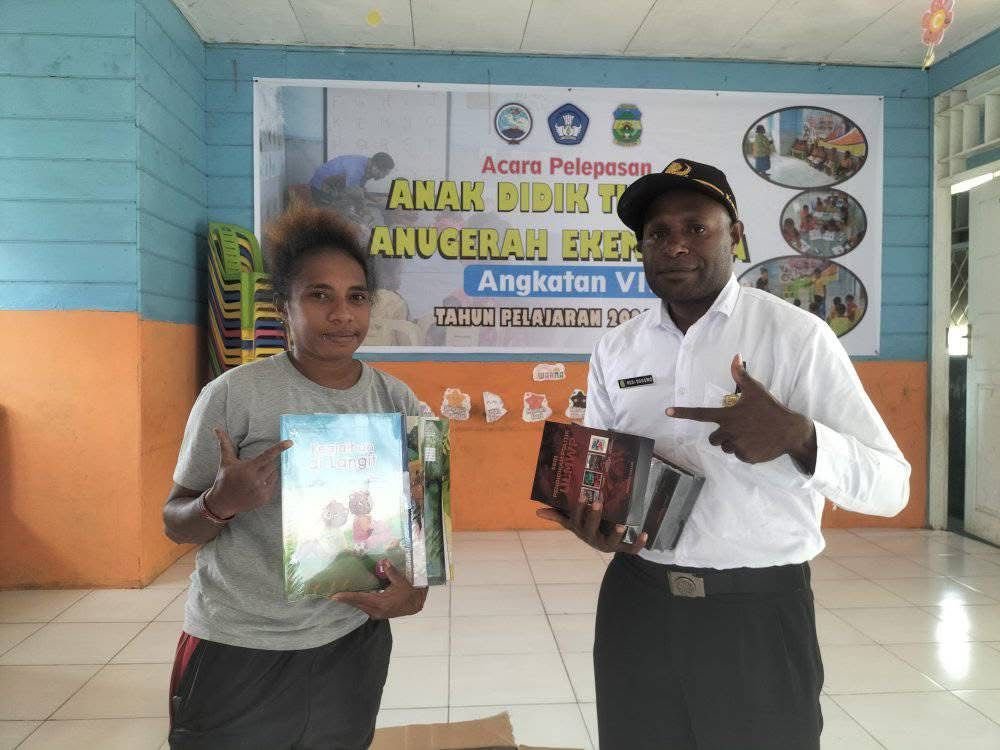 DOGIYAI, TOMEI.ID | Komunitas Literasi Dogiyai Maju (KLDM) menerima dorongan signifikan dalam penguatan program literasinya melalui penyerahan donasi buku dari TK-PAUD Anugerah, yang dikelola oleh Yayasan Pendidikan dan Kesejahteraan Masyarakat (YAPEKMA).