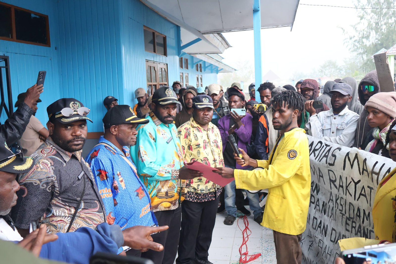 Mahasiswa menyerahkan pernyataan sikap kepada pejabat pemerintah daerah dalam aksi solidaritas di Paniai lalu, menuntut pencairan dana Pansus guna mengawal aspirasi masyarakat. [Foto: Paul Mote for tomei.id].