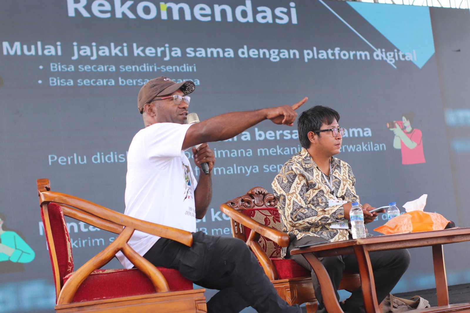 Anggota Komite Publisher Rights Pusat sekaligus Koordinator Bidang Pelatihan dan Program Jurnalisme Berkualitas, Sasmito Mardim, didampingi, Albert Yomo, Editor Media Jubi.id memberika materi pada kegiatan Festival Media Papua Pertama di Nabire, Rabu (14/1/2026). (Foto: Christian Degei/tomei.id).