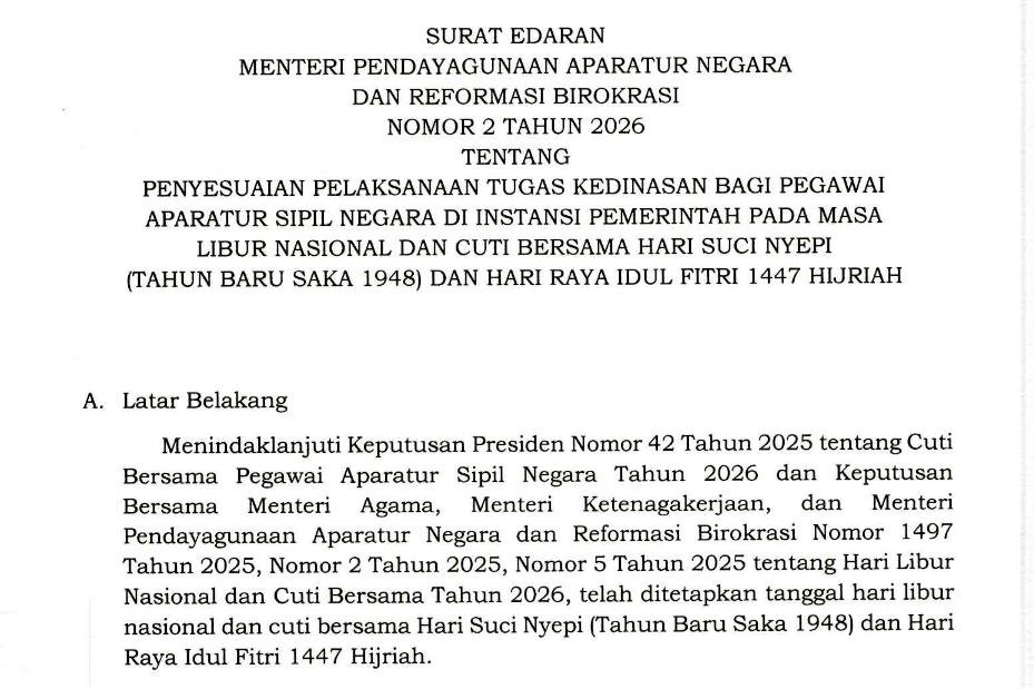 Pemerintah melalui Menteri Pendayagunaan Aparatur Negara dan Reformasi Birokrasi (PANRB), Rini Widyantini, menerbitkan Surat Edaran (SE) Nomor 2 Tahun 2026 tentang Penyesuaian Pelaksanaan Tugas Kedinasan bagi Aparatur Sipil Negara (ASN) menjelang libur nasional dan cuti bersama Hari Suci Nyepi Tahun Baru Saka 1948 serta Hari Raya Idulfitri 1447 Hijriah. (Istimewa).