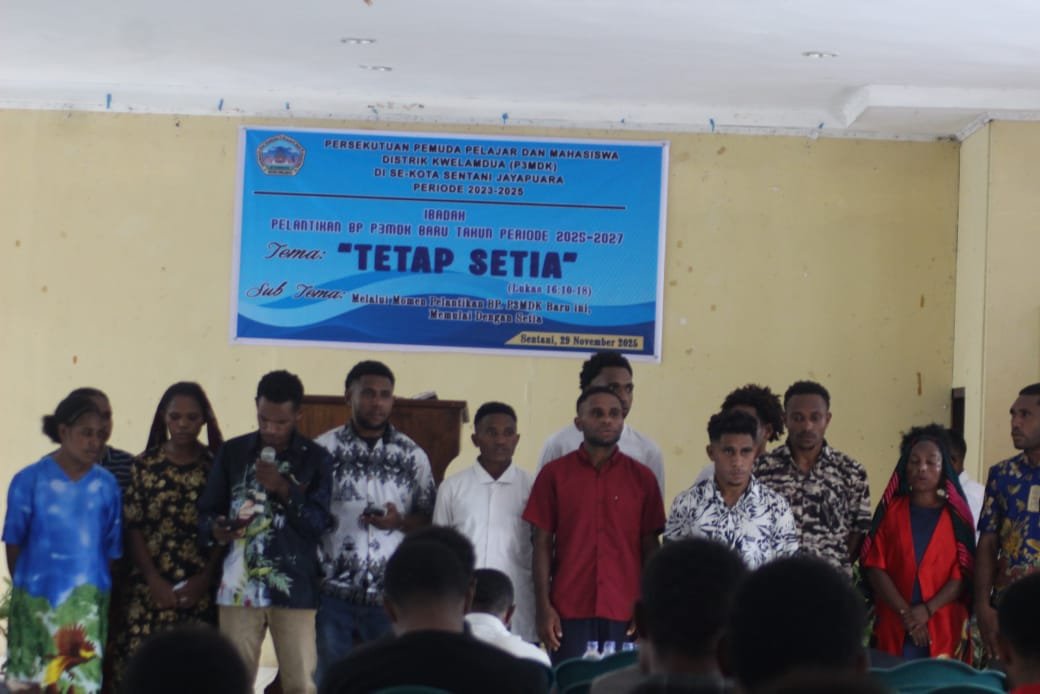 JAYAPURA, TOMEI.ID | Persekutuan Pemuda Pelajar Mahasiswa Distrik Kwelamdua (P3MDK) Kota Sentani resmi mengukuhkan pengurus baru periode 2025–2027 dalam upacara pelantikan di Aula Palai Trans, Sentani, Sabtu (29/11/2025).