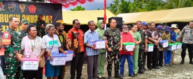 Selain itu, Pangdam XVII/Cenderawasih juga menyerahkan secara simbolis 300 paket sembako kepada warga Kampung Manunggal Jaya serta menghadiri panggung hiburan rakyat yang menambah suasana kebersamaan antara TNI dan masyarakat.