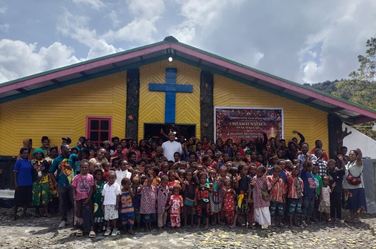 Anak–anak, pelajar, mahasiswa, dan warga empat kampung di Distrik Siriwo berpose bersama usai Misa Natal di Gereja Kampung Ugida, Kabupaten Nabire, Papua Tengah. (Foto: Jhon/tomei.id).