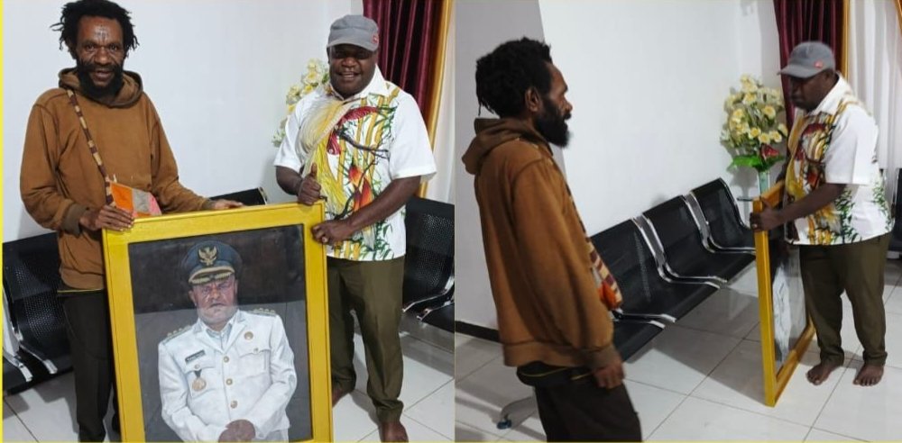 Pelukis Asal Dogiyai Vitalis Goo Berikan Hadiah Natal Lukisan Wajah Bupati Yudas Tebai untuk Ketiga Kalinya