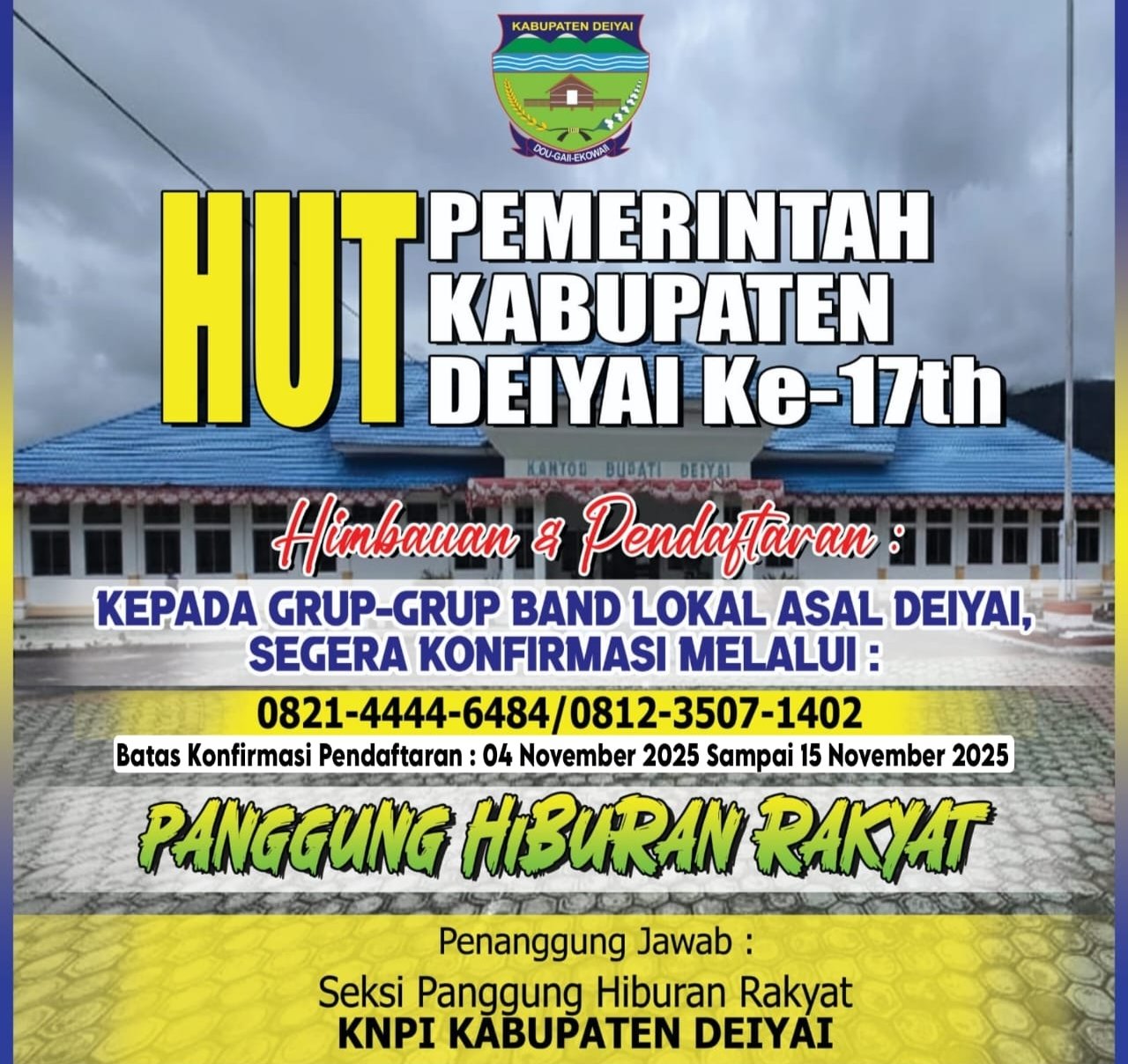 DEIYAI, TOMEI.ID | Menyongsong Hari Ulang Tahun (HUT) ke-17 Kabupaten Deiyai yang akan digelar pada 26 November 2025 mendatang, Pemerintah Kabupaten (Pemkab) Deiyai mengajak para musisi dan grup band lokal untuk turut ambil bagian dalam memeriahkan panggung hiburan rakyat.