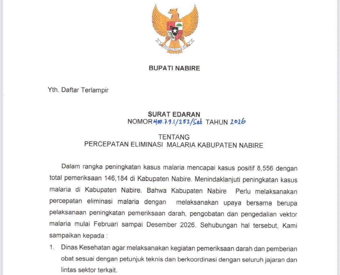 Surat Edaran Bupati Nabire Nomor 400.7.9.1/252/Sek Tahun 2026 tentang Percepatan Eliminasi Malaria menegaskan kewajiban seluruh Organisasi Perangkat Daerah (OPD), pemerintah distrik, Tim Penggerak PKK, hingga kepala kampung untuk terlibat aktif dalam pengendalian malaria di wilayah masing-masing.