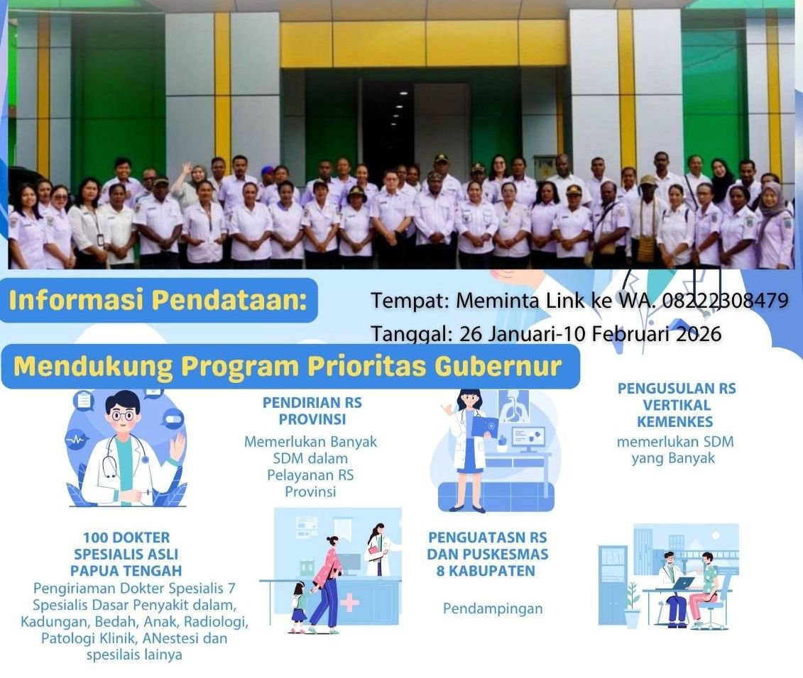 Selain itu, pendataan ini juga diarahkan untuk mendukung program pengiriman dan penempatan 100 dokter spesialis asli Papua Tengah, yang meliputi tujuh spesialis dasar, yakni penyakit dalam, kebidanan dan kandungan, bedah, anak, radiologi, patologi klinik, anestesi, serta spesialisasi lainnya sesuai kebutuhan pelayanan kesehatan daerah.