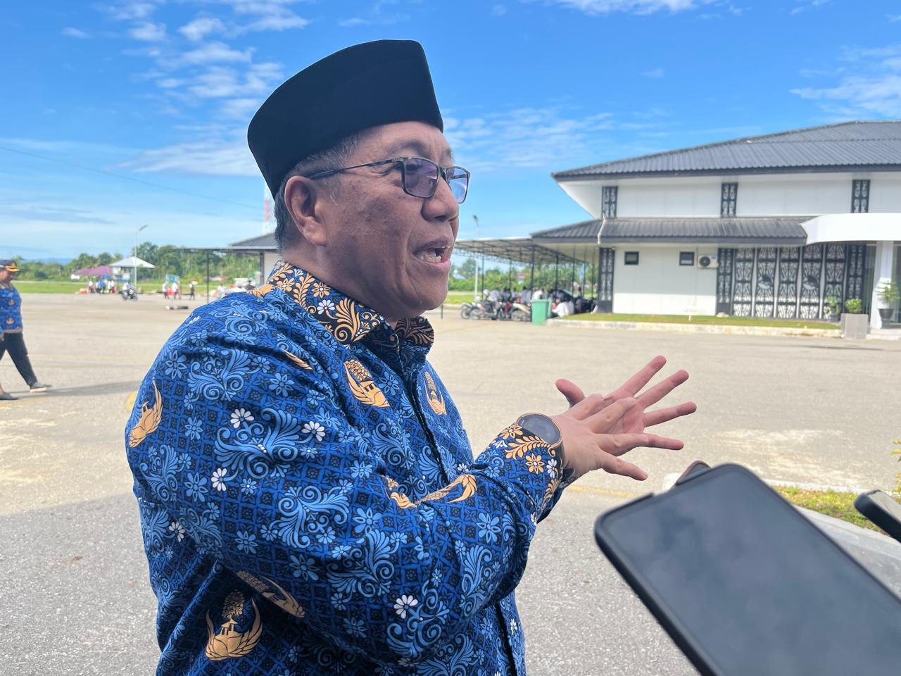 Pelaksana Tugas Sekretaris Daerah Papua Tengah Silwanus Sumule memberikan keterangan kepada awak media usai kegiatan pemerintahan di halaman Kantor Gubernur Papua Tengah, Nabire. [Foto: Christian Degei/tomei.id].