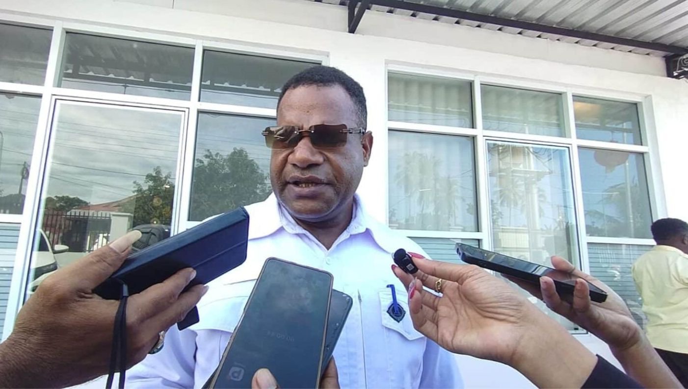 Kepala Dinas Kepemudaan dan Olahraga Papua Tengah, Jems Telenggen, memberikan keterangan kepada awak media di Nabire terkait dukungan pemerintah terhadap pelaksanaan Liga 4 di Papua Tengah. [Foto: Marius for tomei.id].
