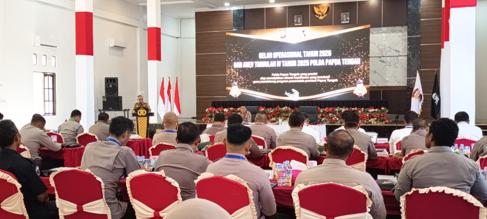 Suasana Rapat Kerja Operasional Kepolisian Tahun 2026 Polda Papua Tengah yang digelar di Aula Wicaksana Laghawa, Polres Nabire, Senin (26/1/2026), dihadiri jajaran pimpinan dan personel kepolisian untuk membahas penguatan strategi keamanan dan ketertiban masyarakat di Papua Tengah. [Foto: Willy for tomei.id).
