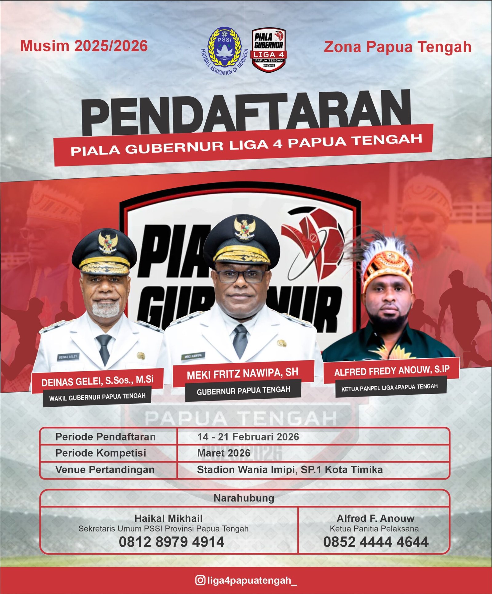 TIMIKA, TOMEI.ID | Pendaftaran Piala Gubernur Liga 4 Papua Tengah musim 2025/2026 resmi dibuka, menandai langkah strategis percepatan pembinaan sepak bola daerah, sebagai bagian dari upaya pembinaan dan pengembangan talenta sepak bola di wilayah Papua Tengah.