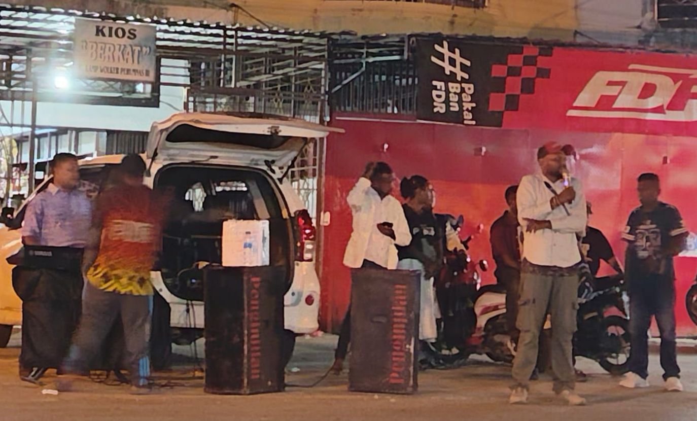 Penginjil jalanan dari Yayasan Papua Pembawa Kabar Baik (YPPKB) menyampaikan pesan rohani dan seruan penghentian peredaran minuman keras kepada masyarakat di kawasan putaran taksi Perumnas III Waena, Distrik Heram, Kota Jayapura, Sabtu (7/2/2026) malam. [Foto: Yeremias/tomei.id].