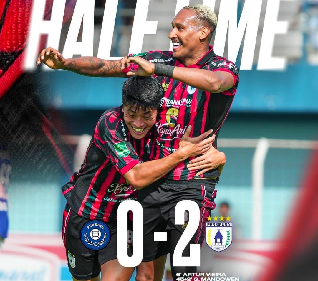 JAYAPURA, TOMEI.ID | Persipura Jayapura tampil perkasa dan membuka jalan menuju puncak klasemen Grup Timur Pegadaian Championship 2025/2026 usai unggul 2-0 atas Persiku Kudus pada babak pertama laga pekan ke-18 di Stadion Wergu Wetan, Kudus, Jawa Tengah, Jumat (30/1/2026).