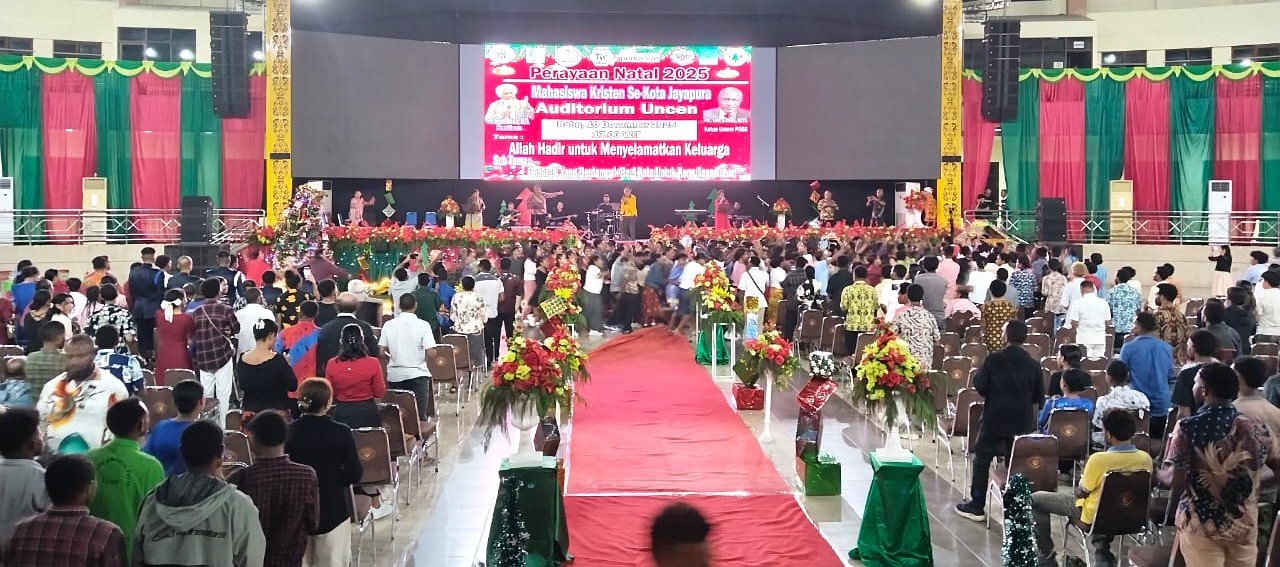 JAYAPURA, TOMEI.ID | Perayaan Natal Mahasiswa Kristen se-Kota Jayapura untuk pertama kalinya digelar di Auditorium Universitas Cenderawasih (Uncen), Rabu (10/12/2025) malam.