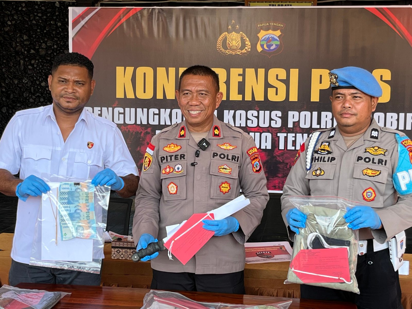 Polres Nabire menggelar Konferensi Pers pengungkapan sejumlah kasus termasuk kasus pencurian dengan kekerasan (jambret) yang terjadi di Jalan Trikora, tepatnya di depan Aspol Kota Lama, Kabupaten Nabire. [Foto: Christian Degei/tomei.id].