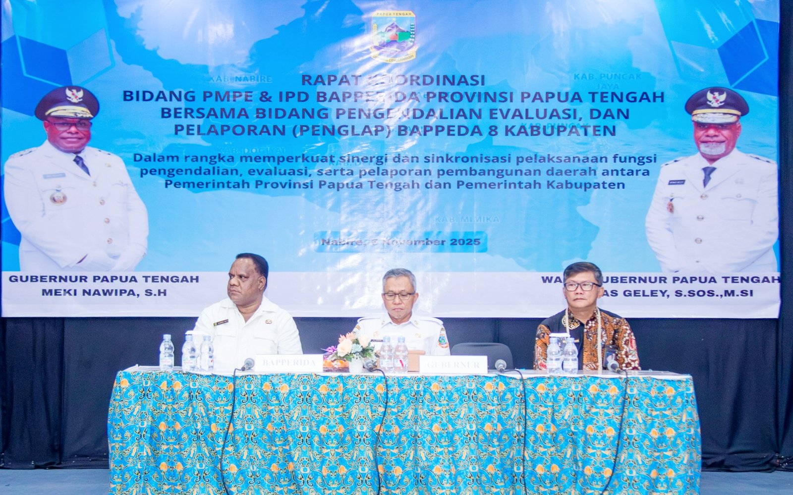 Dalam sambutannya, Tumiran menegaskan bahwa rapat koordinasi ini merupakan langkah strategis untuk memperkuat koordinasi lintas wilayah, memperkokoh konsolidasi data, serta menyatukan sistem pengendalian dan evaluasi pembangunan di delapan kabupaten se-Papua Tengah.