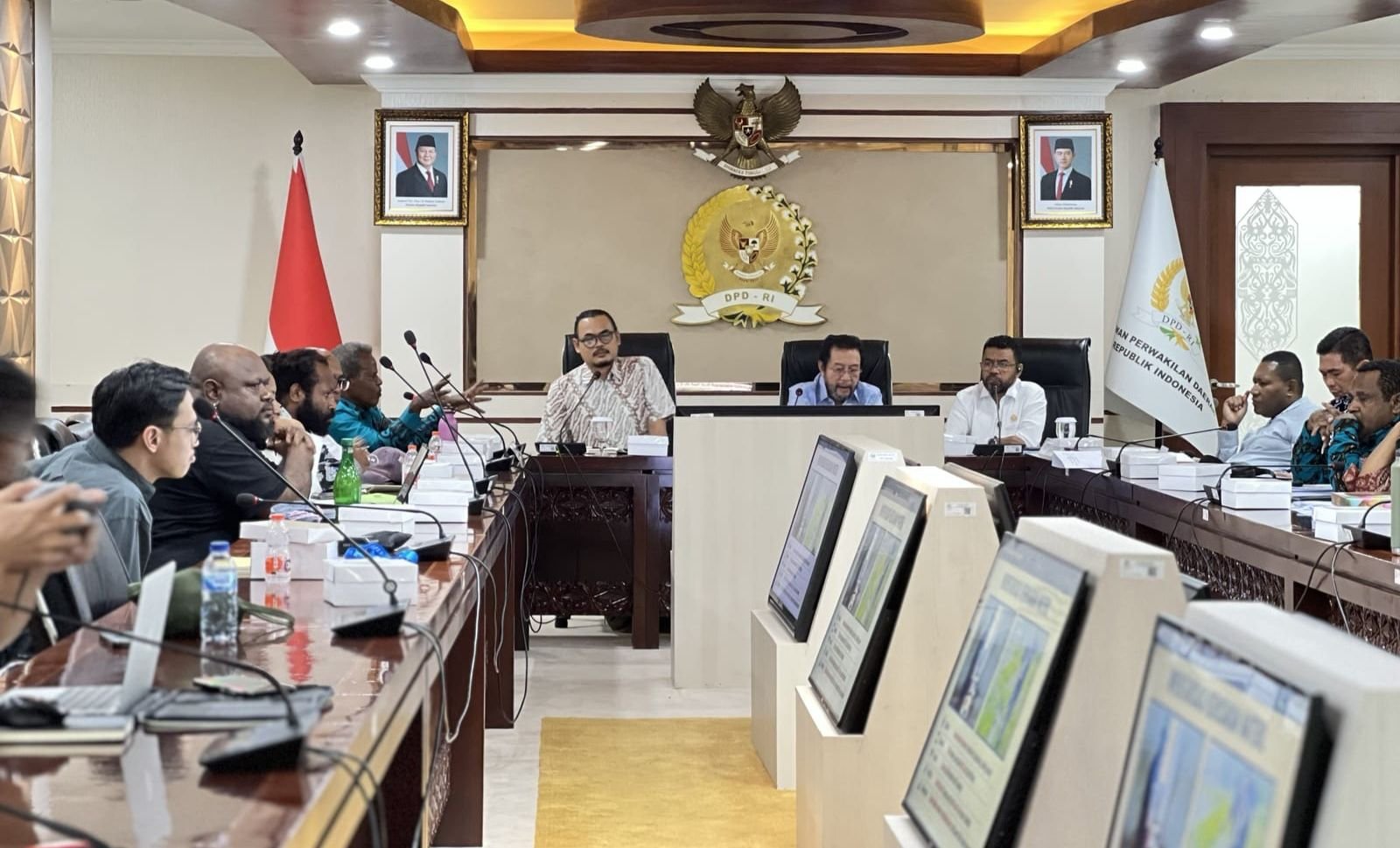 Suasana audiensi Dewan Perwakilan Daerah Republik Indonesia bersama perwakilan Rumah Solidaritas Papua dan anggota DPD RI asal Papua di Gedung DPD RI, Jakarta, membahas rekomendasi penanganan konflik dan krisis kemanusiaan di Tanah Papua. [Foto: Istimewa].