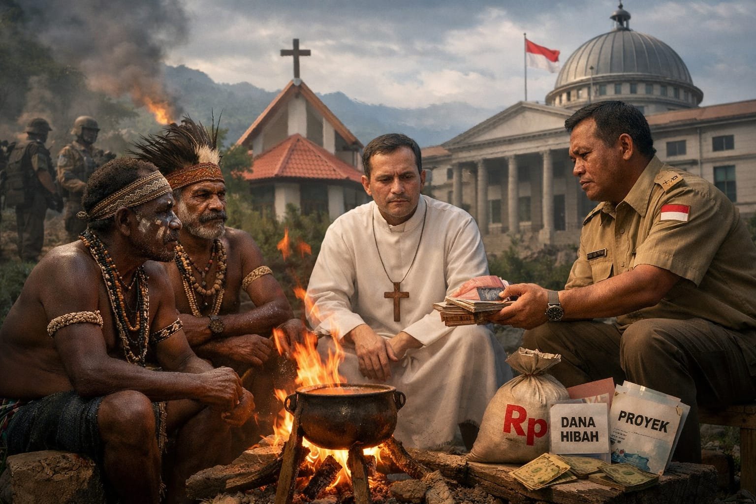 Salah satu realitas paling krusial dalam dinamika tiga tungku di Papua adalah peran uang negara sebagai instrumen kekuasaan. Dalam konteks Keuskupan Jayapura dan wilayah sekitarnya (2024–2026), uang tidak lagi netral sebagai sarana pembangunan, tetapi sering berfungsi sebagai alat untuk membentuk kepatuhan, meredam kritik, dan memperoleh legitimasi sosial. Di sinilah terjadi kooptasi terhadap adat dan Gereja secara halus namun sistemik.