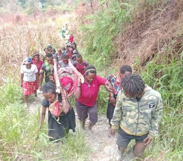 Warga kampung di wilayah pedalaman Papua bahu-membahu menandu seorang warga melewati jalan setapak dan medan terjal untuk mendapatkan akses pertolongan, mencerminkan keterbatasan infrastruktur dan layanan dasar di daerah terpencil. [Foto: Dokumentasi warga).