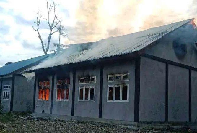 Bangunan SMK Negeri 2 Dekai tampak terbakar setelah dilalap api di Dekai, Kabupaten Yahukimo, Sabtu (14/2/2026). Insiden ini memicu kekhawatiran terhadap keselamatan fasilitas pendidikan dan keamanan warga sipil di wilayah tersebut. [Foto: Dok TPNPB).