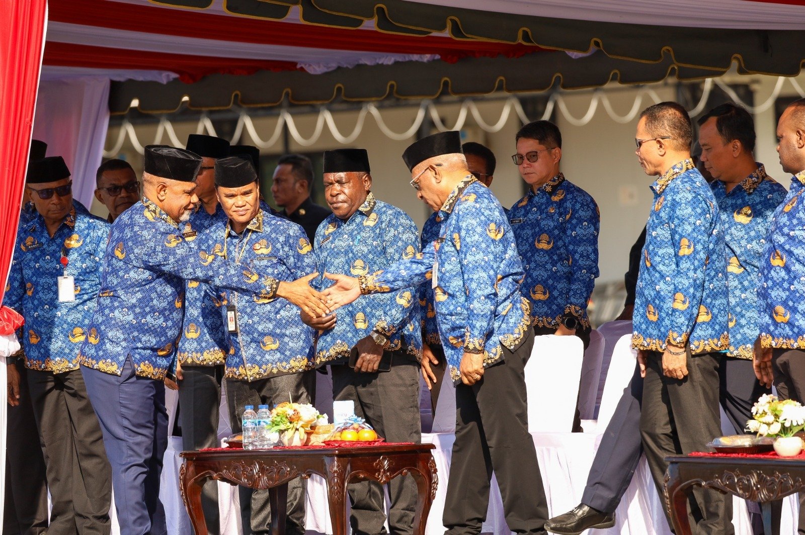 Wakil Gubernur Papua Tengah bersalaman dengan jajaran pejabat Organisasi Perangkat Daerah (OPD) usai apel gabungan ASN di Nabire, Senin (19/1/2026). [Foto: Humas Pemprov Papua Tengah).